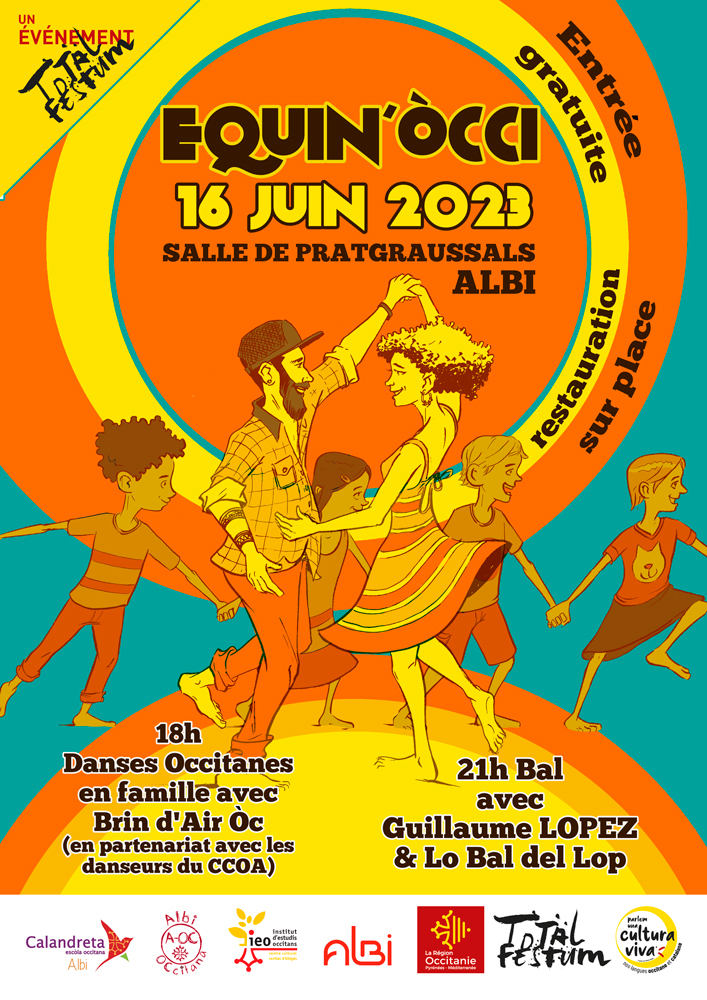 L'école Calandreta d'Albi et l'association Albi Occitana organisent le 16 juin 2023, dans le cadre de Total Festum, l'événement intergénérationnel Equin'òcci, une soirée dédiée à la culture occitane dans la salle de Pratgraussals. Au programme de cet événement gratuit : danses familiales occitanes et balèti ! Un service de restauration (repas complet ou sur le pouce) sera proposé sur place.