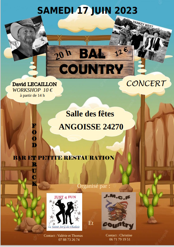 Le Samedi, 17 Juin 2023, un Workshop de *David Lecaillon*, suivi d’un Bal Country Concert avec Concert de * Yankey West*, sont organisés par *Country Line Passion*, avec *Jerome Megret* à la salle des Fetes de Angoisse (24270), en Dordogne, France.