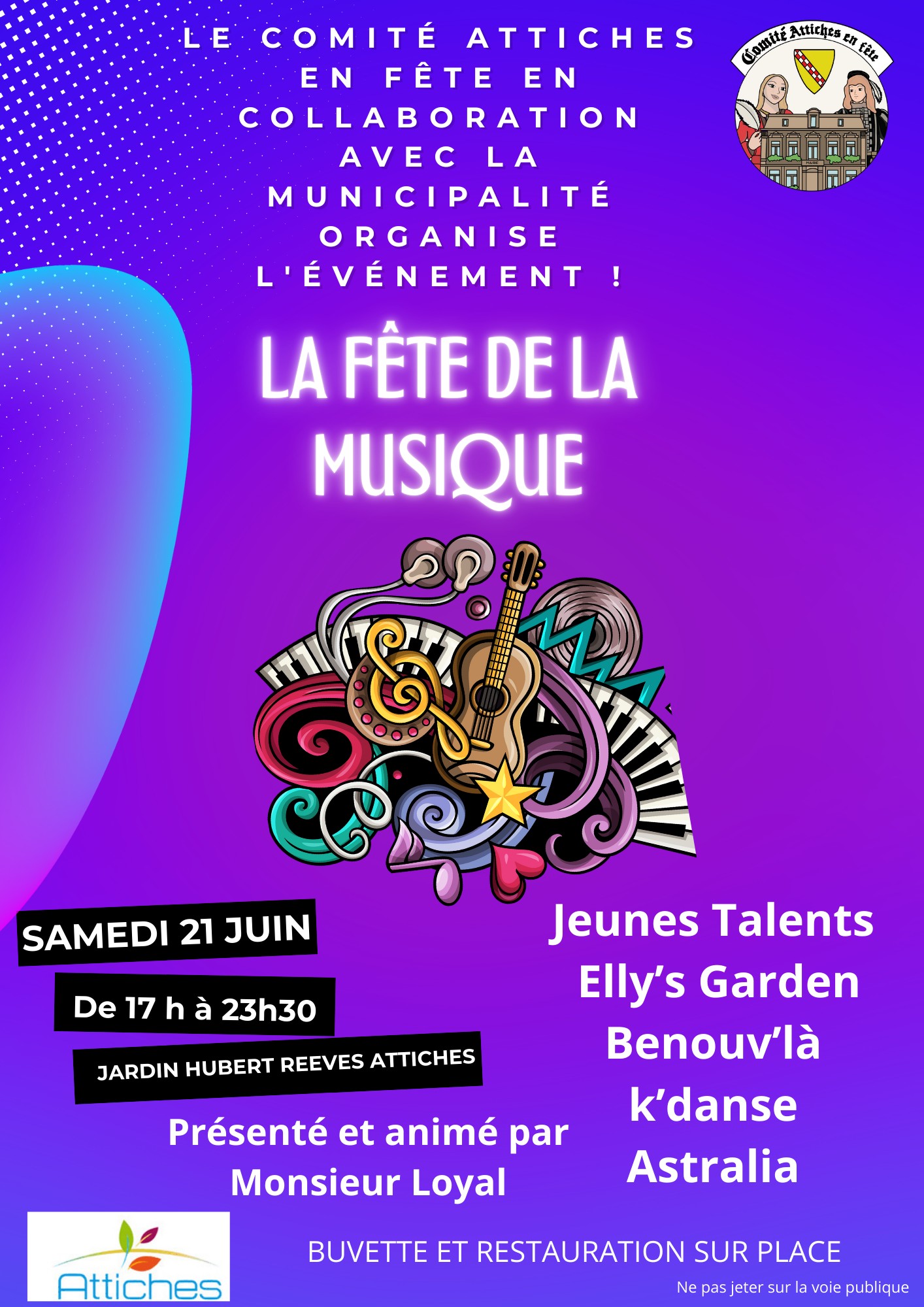 Le samedi 21 juin 2025, la commune d’Attiches vous convie à une soirée musicale exceptionnelle au Jardin Hubert Reeves, situé rue Jean-Baptiste Collette. Organisé par le Comité Attiches en Fête, cet événement promet une ambiance festive et conviviale, mettant en lumière les talents locaux.