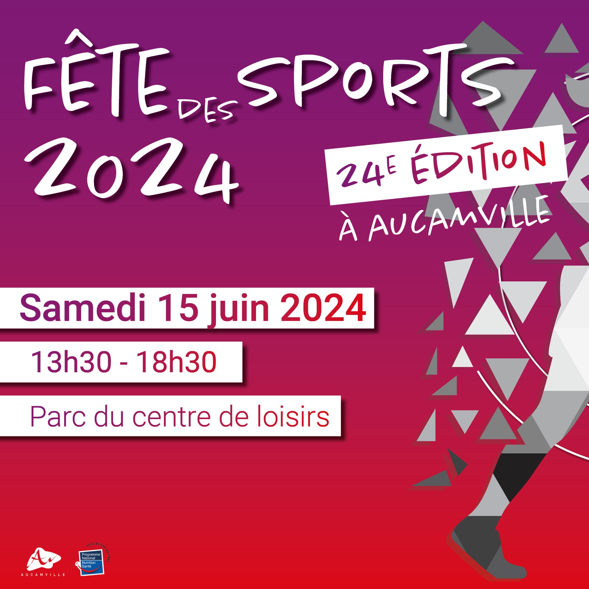 >Sur inscription : https://www.ville-aucamville.fr/actualites/sport-les-inscriptions-pour-la-fete-des-sports-2024-sont-lancees/#:~:text=toutes%20les%20actualités-,%5BSPORT%5D%20Les%20inscriptions%20pour%20la%20Fête%20des%20Sports%202024%20sont,Parc%20du%20Centre%20de%20loisirs.