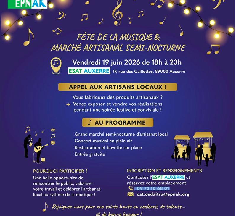 L’ESAT d’Auxerre organise pour la 2ᵉ année un grand marché artisanal semi-nocturne à l’occasion de la Fête de la Musique, le vendredi 19 juin 2026 de 18h à 23h, au 17 rue des Caillottes à Auxerre !
