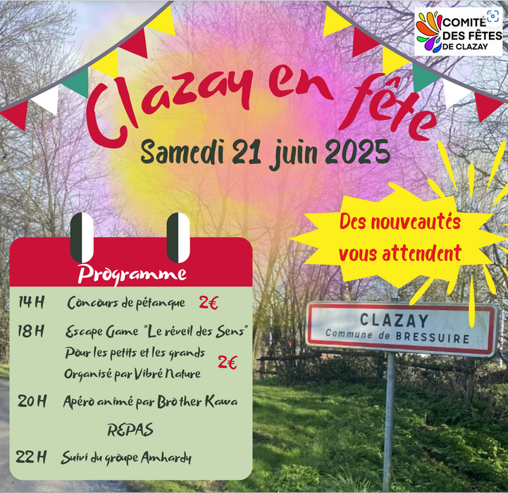 A voir sur le site : https://www.ville-bressuire.fr/index.php/loisirs-et-animations/vie-associative/agenda/2642-clazay-en-fete-4/2025-06-21-14-00
