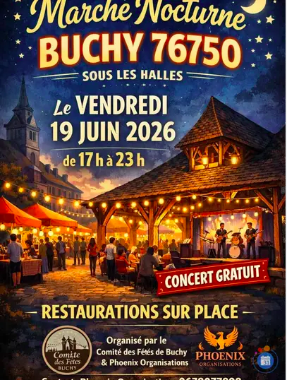 Le Comité des Fêtes de Buchy et Phoenix Organisations vous invitent au marché nocturne, le vendredi 19 juin 2026, sous les halles et place de la mairie, en centre-ville.
