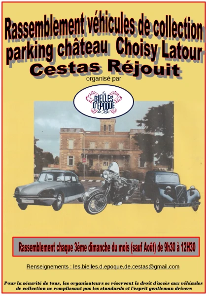 Chaque 3ᵉ dimanche du mois, tout au long de l’année (sauf en août), le club Les Bielles d'Époque de Cestas organise un rassemblement dédié aux passionnés de véhicules anciens.