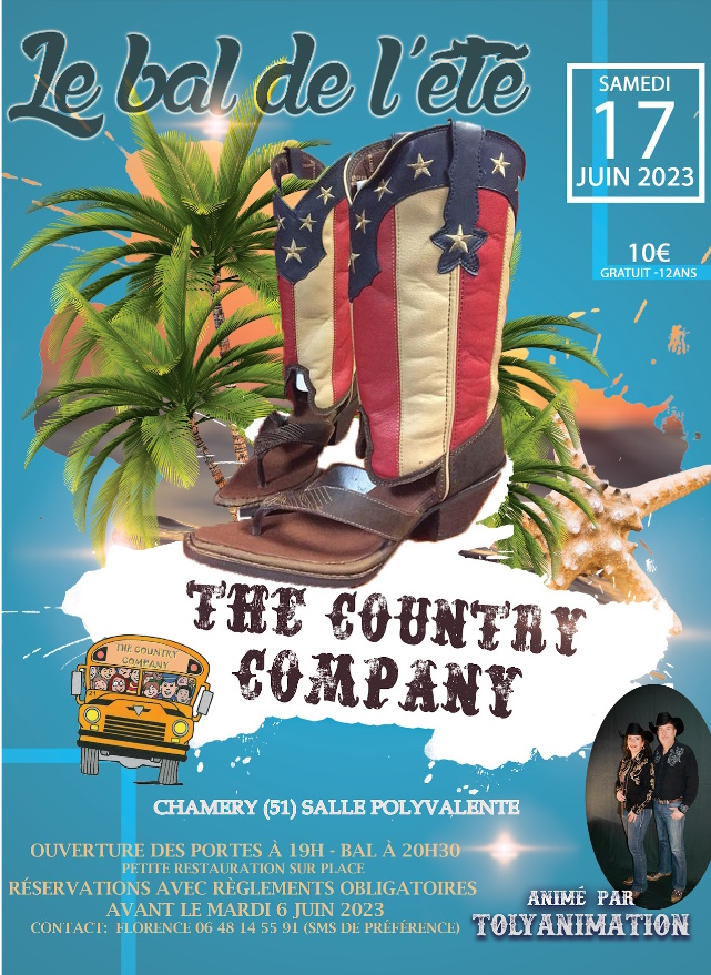 Le Samedi, 17 Juin 2023, un Bal Country de L’été, vous est présenté par *The Country Company* et sera animé par *Tolyanimation*, à 20h30, Salle Polyvalente de Chamery (51500), dans la Marne, France.