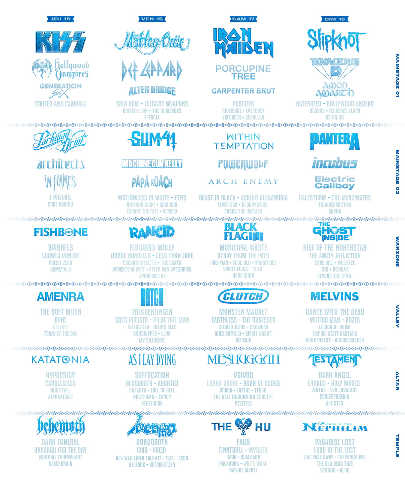 En 2023, les festivaliers auront donc le plaisir de retrouver en live Iron Maiden, Slipknot, Kiss, Pantera, Mötley Crüe, Def Leppard, Parkway Drive, Rancid, Papa Roach ou encore Amon Amarth et Porcupine Tree, mais aussi Behemoth, Sum 41, Clutch, Katatonia, Amenra et Monster Magnet.