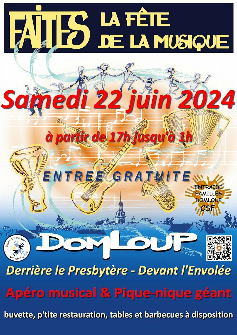 L’association Entraide Familles Domloup CSF organise la vingt-et-deuxième édition très attendue de Faîtes de la Musique, prochain événement convivial et festif qui aura lieu le **samedi 22 juin 2024**, derrière le Presbytère pour la première partie à partir de 17h puis devant la médiathèque L’Envolée et la Salle des Sports après 20h pour la deuxième partie. Ici c’est Domloup !