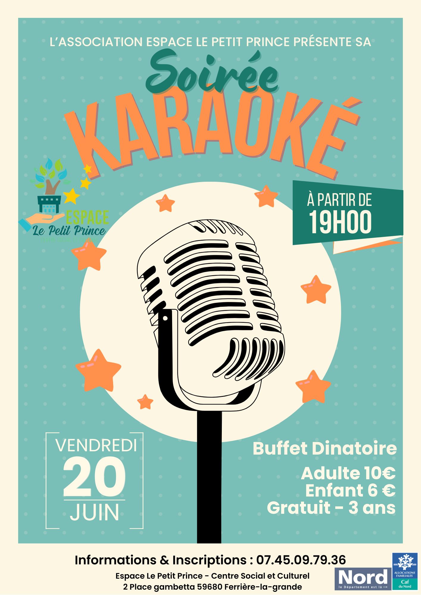 L’association Espace Le Petit Prince vous invite à sa grande Soirée Karaoké le vendredi 20 juin 2025, à partir de 19h, au Centre Social et Culturel de Ferrière-la-Grande.