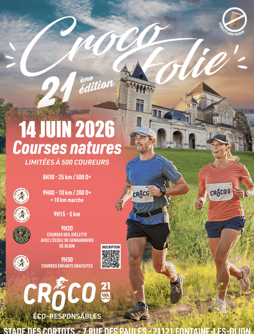 La Crocofolie revient pour sa 21ème édition à Fontaine les Dijon le 14 juin 2026. L'organisation est assurée par l'association Coureurs sur Route de Côte d'Or (CROCO). Le point de rassemblement et départ est indiqué au stade des Cortots, 7 rue des Paules, Fontaine.