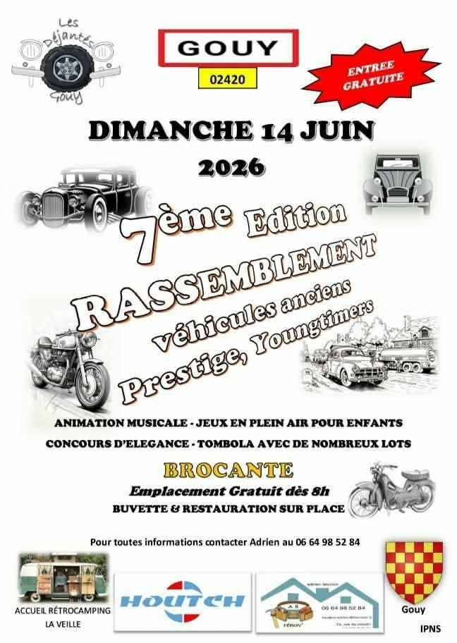 Le club Les Déjantés de Gouy aura le plaisir de vous accueillir le dimanche 14 Juin 2026 de 8h à 18h à Gouy pour un grand rassemblement de motos, mobylettes et voitures anciennes, d’exception et de prestige.