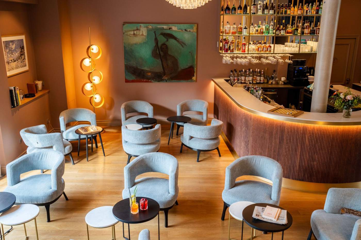 La décoration marie le charme de cette bâtisse historique en centre-ville avec son sol en terrazzo inspirée de l’ancienne poste d’Honfleur et du mobilier contemporain, comme ces lampes en laiton et les fauteuils cosy qui appellent à entrer pour découvrir l’atmosphère de ce bar lounge unique à Honfleur.
