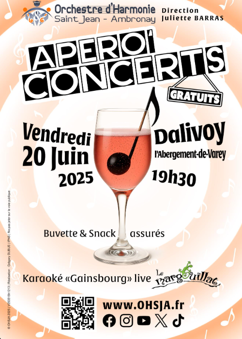 L'Orchestre d'Harmonie Saint Jean - Ambronay OHSJA vous invite à son Apéro Concert le vendredi 20 juin 2025 à 19h30 sur la place des platanes à Dalivoy, sous la direction de Juliette BARRAS.