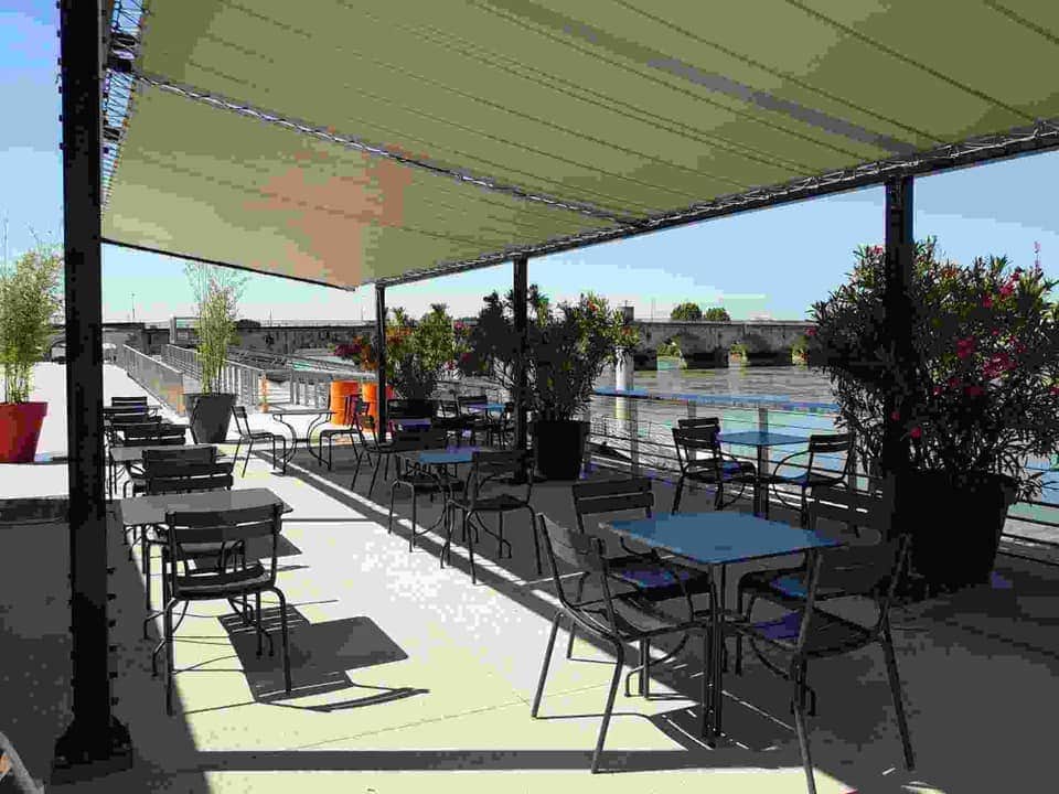 Restaurant éphémère avec terrasse servant des crêpes et d'autres douceurs à déguster face à la Garonne