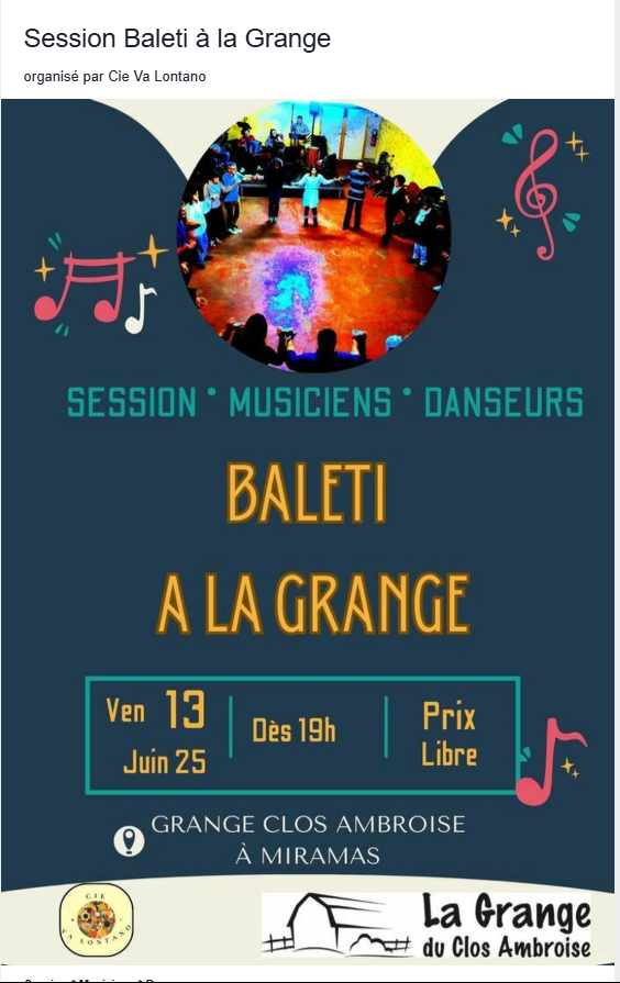 De 19h à 20h : Atelier Musique (répétition musiciens, danseurs-ses bienvenu-es).
