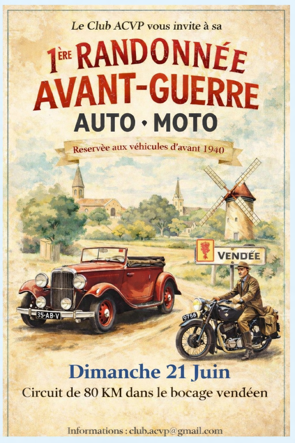 Le Club ACVP est heureux de vous convier à sa 1ère Randonnée en véhicules d'avant-guerre autos et motos.