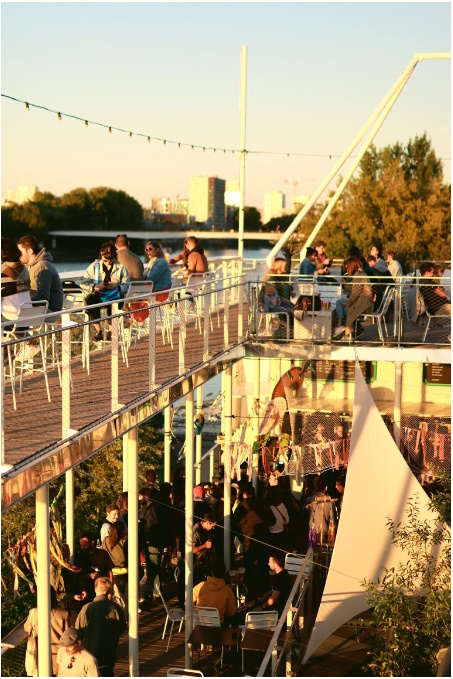 Sur les berges de bords de Loire, côté Île de Nantes, la Guinguette du Belvédère vous accueille tous les jours de la semaine pour boire un verre, admirer la vue, écouter de la musique, s’amuser avec les enfants, s’asseoir sur des bouées ou simplement profiter du coucher de soleil.