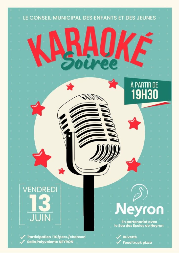 Soirée karaoké organisée par le CME/CMJ vendredi 13 juin à 19h30 salle polyvalente, en partenariat avec le Sou des écoles de Neyron.