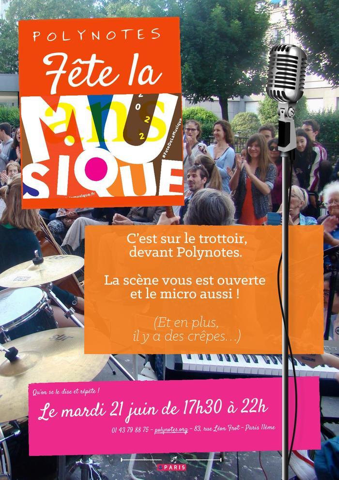 Scène ouverte des profs et élèves de Polynotes. De 17h30 à 22h, sur le trottoire devant l'école de musiques, tous les passants, les enfants et les parents pourront écouter toute une variété de musiques différentes, des chorales aux groupes de musiques actuelles, des chanteurs aux instrumentistes. La scène est ouverte à tous, aux musiciens de tout âge et de tout niveaux. Venez donc jouer !