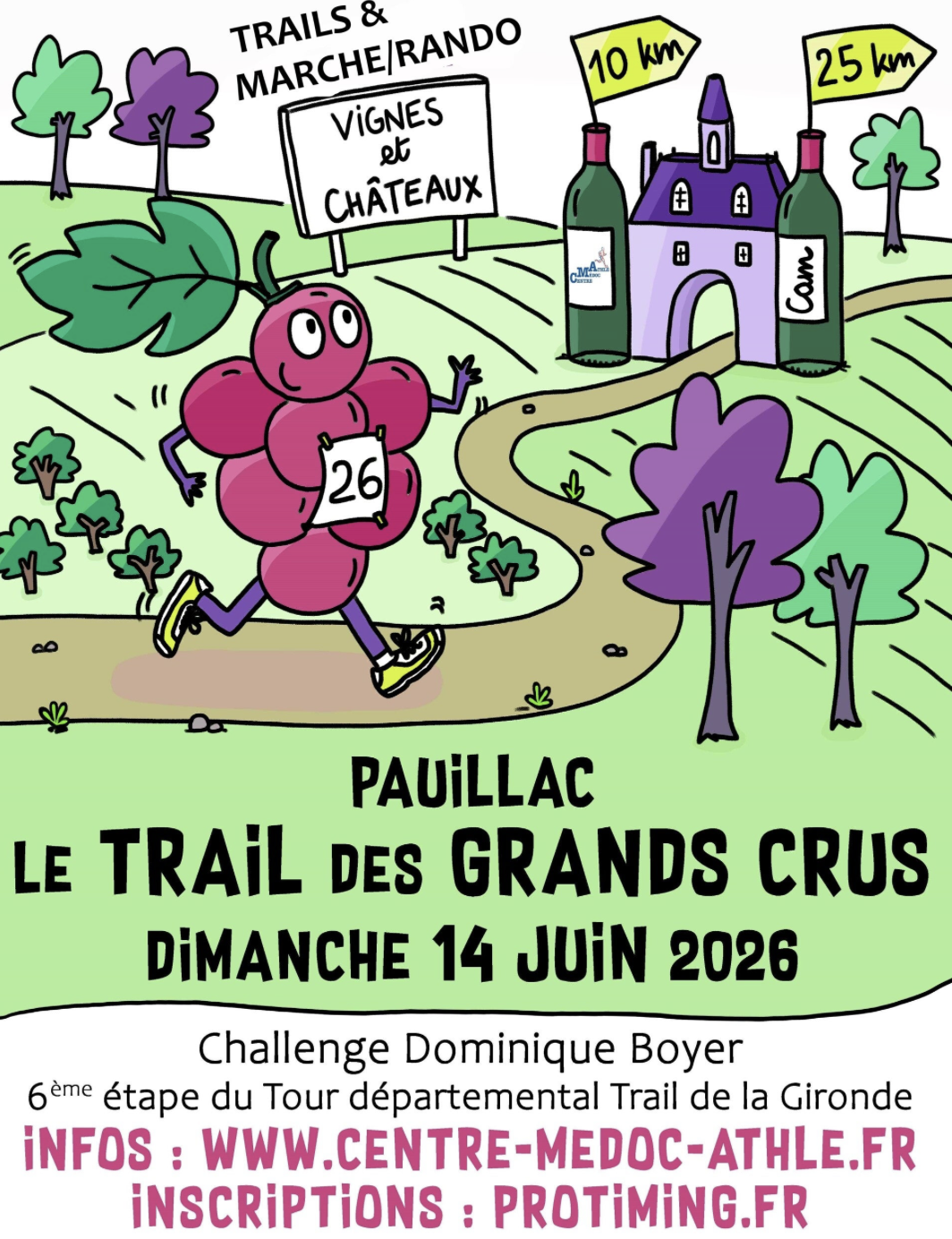 Le retrait des dossards est prévu au magasin Foulées Mérignac, 3 rue Albert Einstein 33700 Mérignac, le 12/06/2026 de 14:00 à 18:00. Un retrait complémentaire a lieu sur le site de départ, sur la plaine des sports de la Garosse à Pauillac, le 14/06/2026 de 07:30 à 09:00.