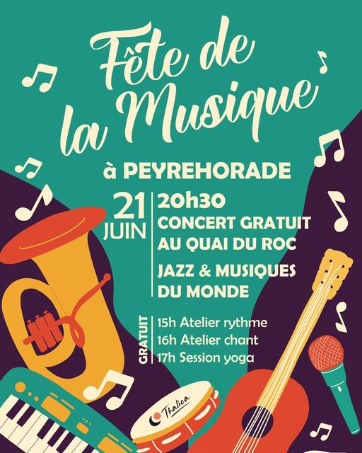Venez célébrer la fête de la musique, le solstice d'été et la journée internationale du yoga à Peyrehorade ! Le concert gratuit au Quai du Roc sera précédé d'une série d'ateliers musique et yoga ouverts à tous dans l'après-midi.