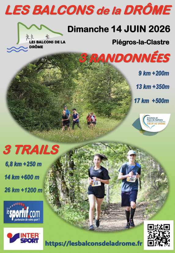 L'événement a lieu à Piégros-la-Clastre le 14 juin 2026 et est organisé par l'ASSOCIATION LES BALCONS DE LA DRÔME. Quatre formats de trail sont proposés dans les contreforts du synclinal perché de la forêt de Saou, avec des profils et des dénivelés renseignés par l'organisateur.