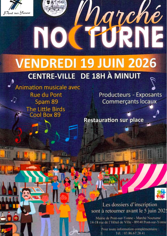 La mairie de Pont-sur-Yonne organise un marché nocturne le vendredi 19 juin 2026, en centre-ville.