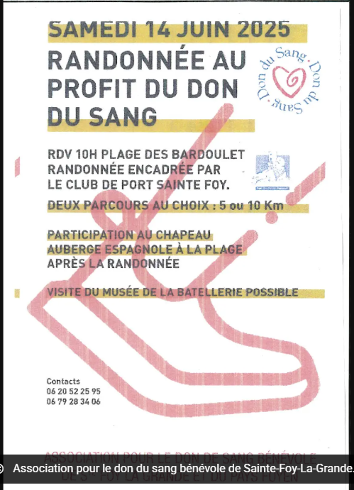 Informations auprès de l'association pour le don du sang bénévole de Sainte-Foy-La-Grande et du Pays Foyen au 06 20 52 25 95 ou 06 79 28 34 06.