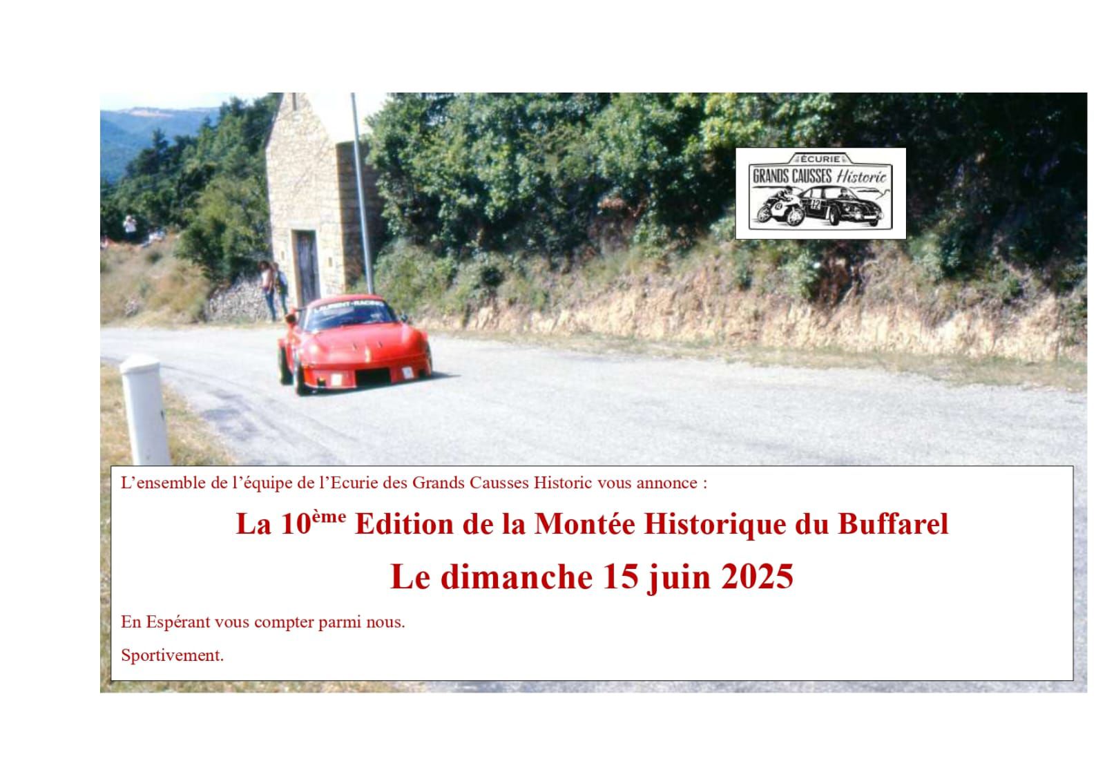 L’Écurie des Grands Causses Historic organise la 10ème édition de la Montée Historique du Buffarel, qui se déroulera le dimanche 15 juin 2025 sur la RD9, entre Boyne et Le Massegros, dans la commune de Rivière-sur-Tarn de 9h à 18h.
