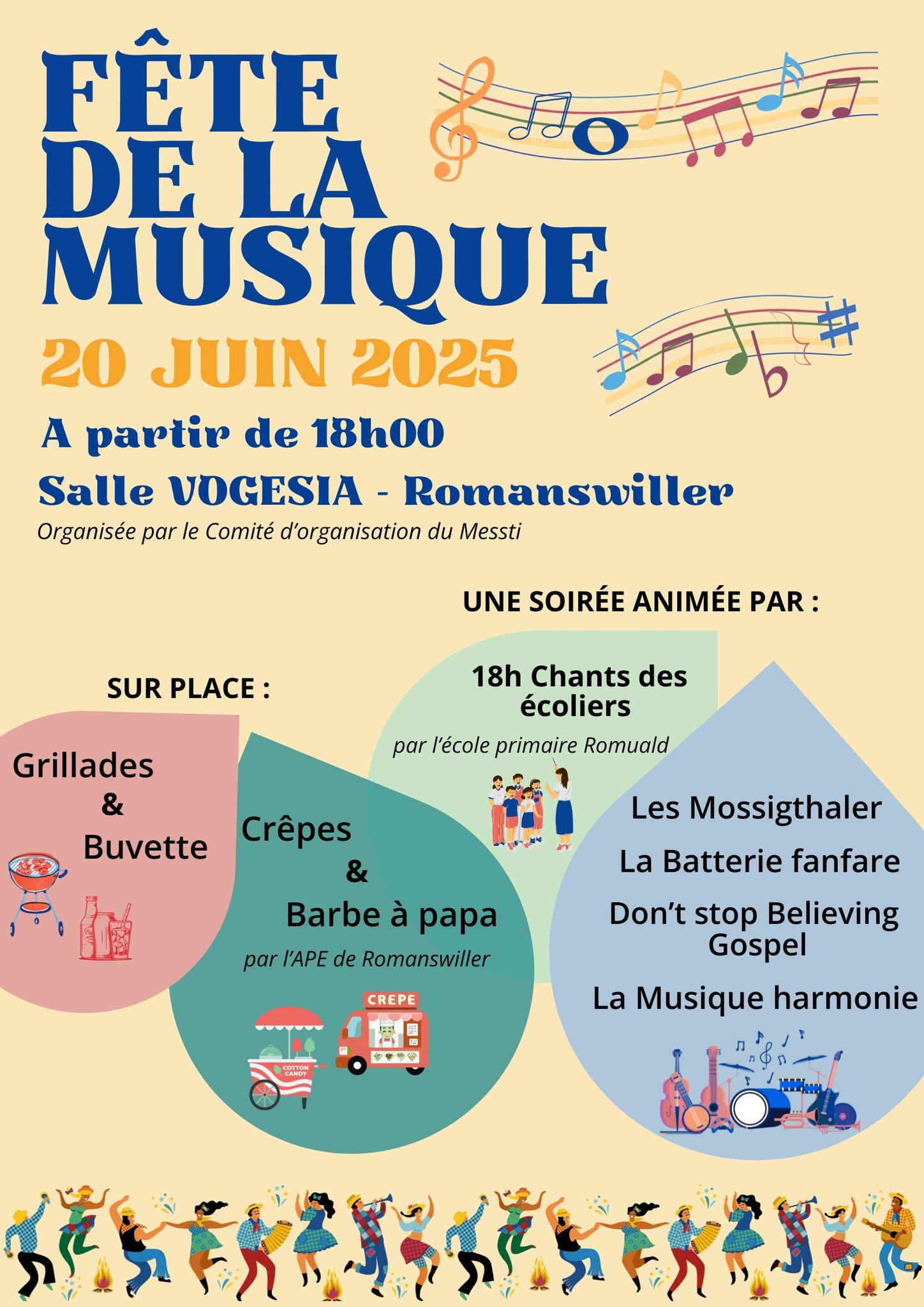 Fête de la Musique 2025 à Romanswiller avec la participation : Association folklorique Mossigthaler, Don't Stop Believing Gospel, Harmonie Romanswiller, La Batterie fanfare et l'école primaire Romuald Une soirée rythmée et gourmande !