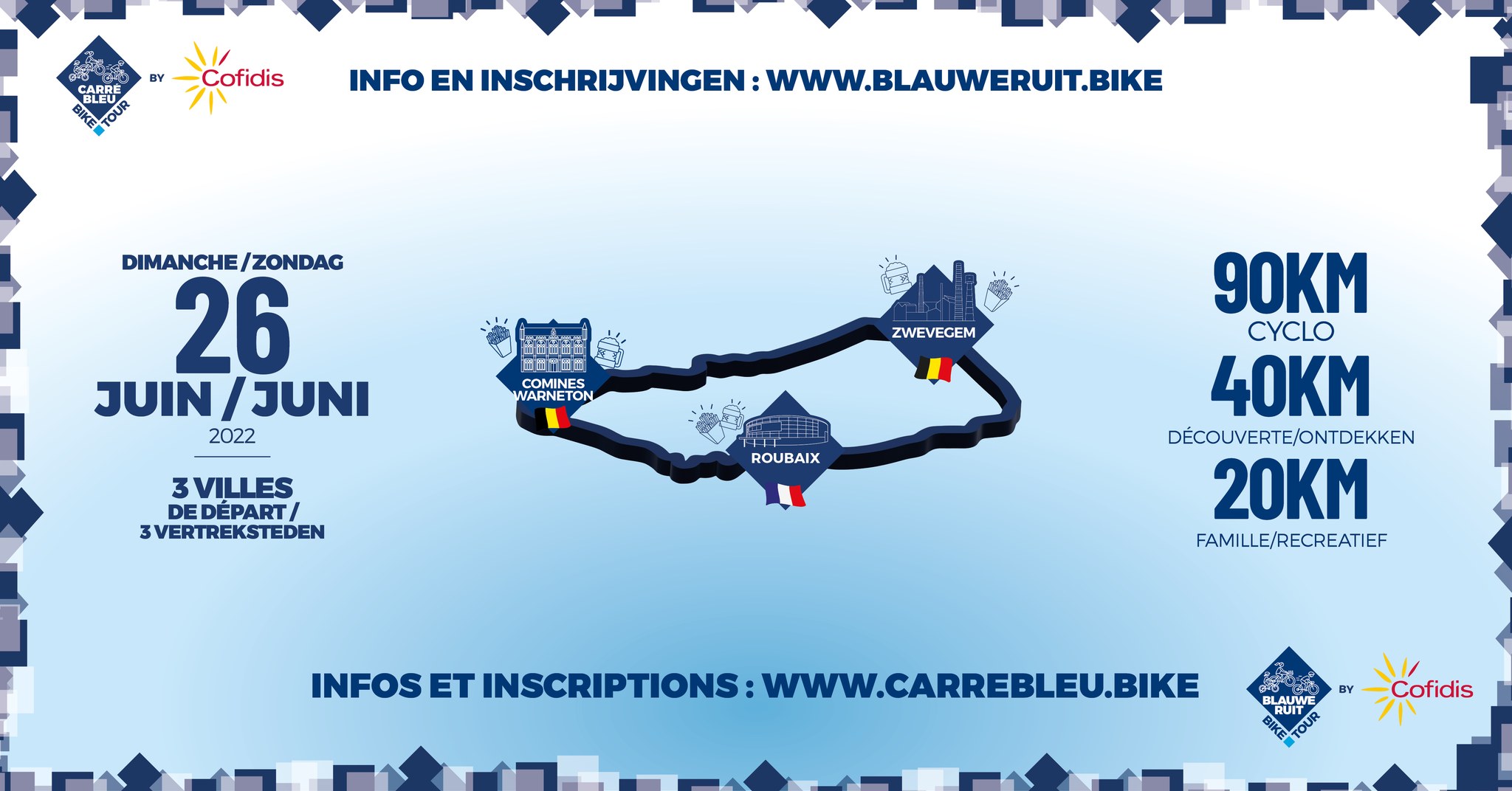 L’Eurométropole Lille-Kortrijk-Tournai, le Club Gagnants et le Comité Grand Lille s’unissent pour mettre en place le 26 juin 2022, la première édition du Carré Bleu Bike Tour, un itinéraire vélo le long des cours d’eau français, flamands et wallons, au cours d’une journée familiale et festive.