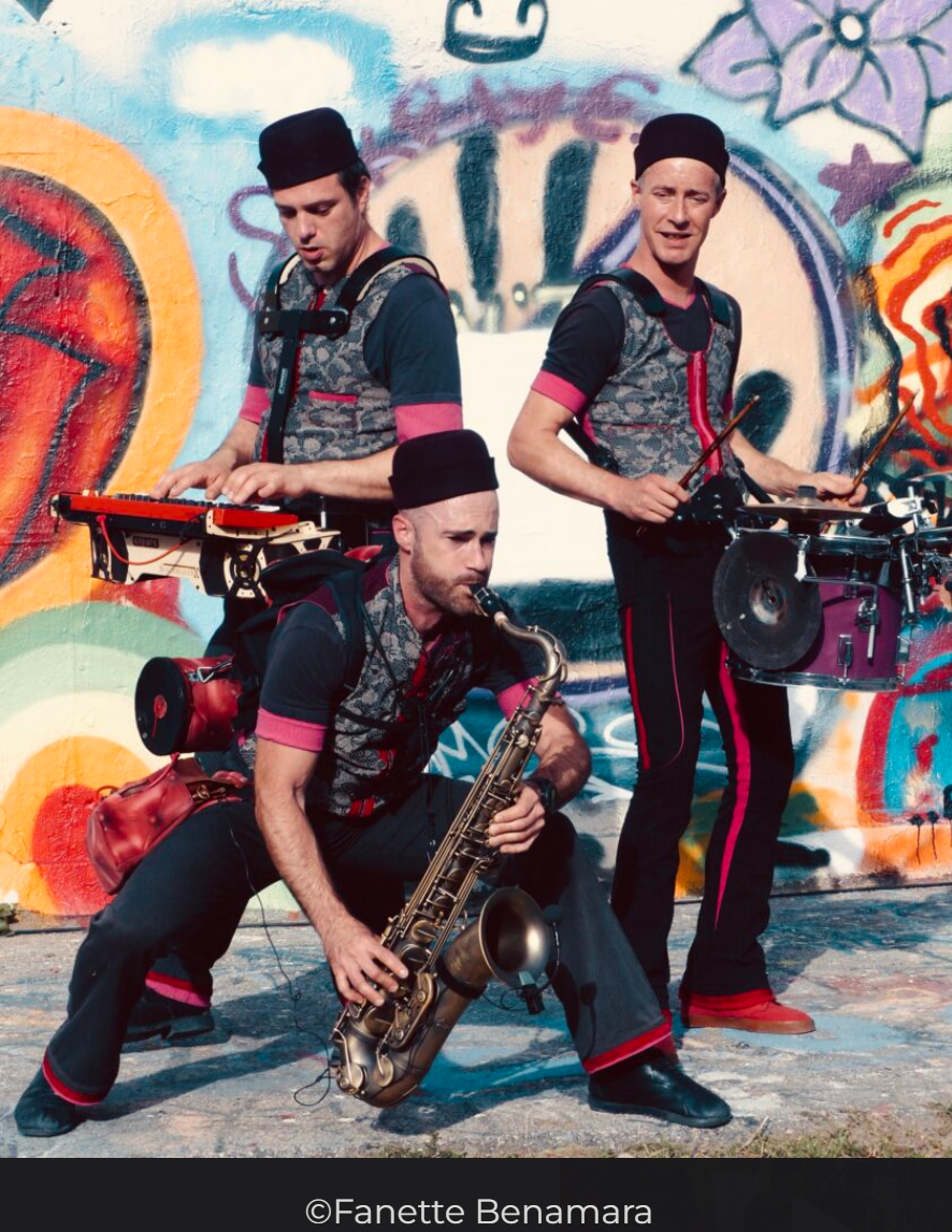 Original et éclectique : Clavier et saxophone amplifies, agrémentes d’effets sonores parfois surprenants, se mêlent aux rythmes énergiques des percussions servant un répertoire de compositions originales et d’airs connus.