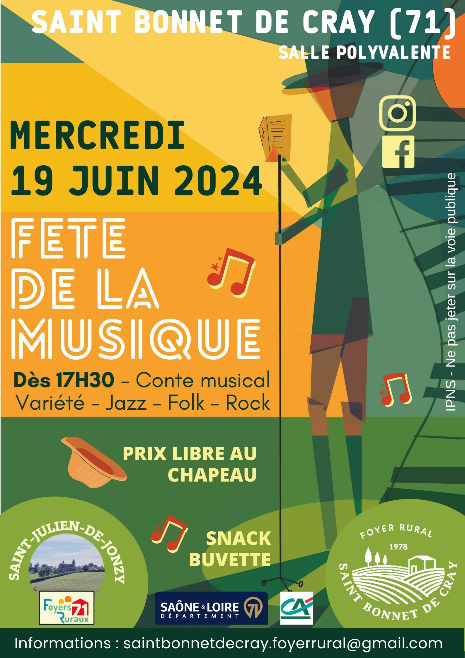 Les Foyers Ruraux de Saint Julien de Jonzy et Saint Bonnet de Cray sont heureux de vous inviter à leur 2ème édition de la Fête de la Musique, le Mercredi 19 Juin 2024 dès 17h30