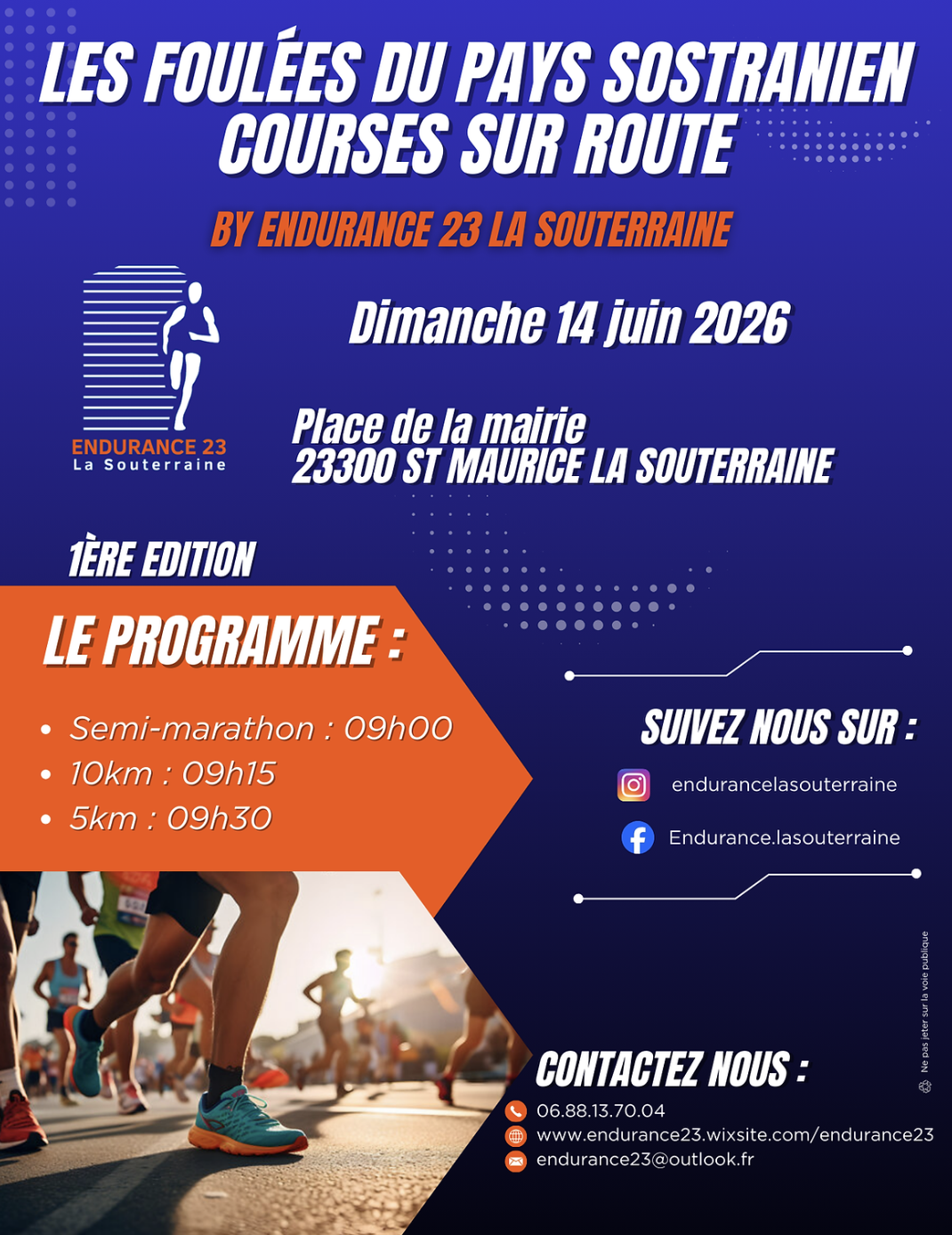 Les Foulées du Pays Sostranien se déroulent le dimanche 14 juin 2026 à Saint-Maurice La Souterraine (23) avec un 5km, un 10km et un semi-marathon.