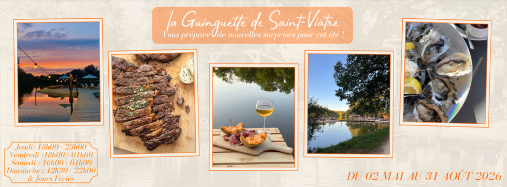 Située au bord d'un étang aménagé, détente et bonne humeur... Venez partager un large choix de boissons et de restauration de Sologne, en famille ou entre amis ! Soirées à thème, animations, spectacles et autres surprises sont au programme ! La Guinguette de Saint-Viâtre, c’est aussi un lieu où l’on se régale : bar à huîtres,