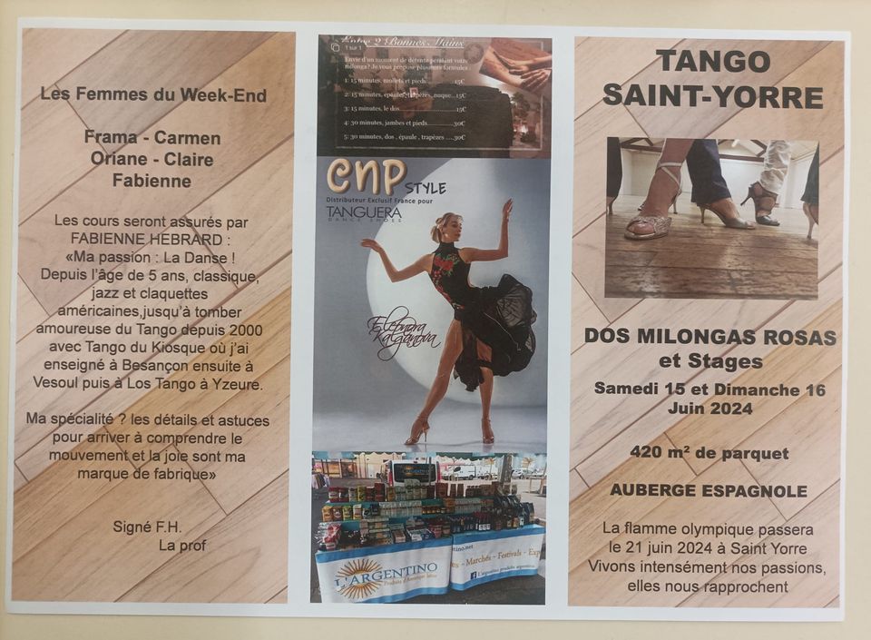 Les cours seront assurés par FABIENNE HEBRARD. 3 cours le samedi, milonga le soir . 2 cours le dimanche ,milonga l'après midi
