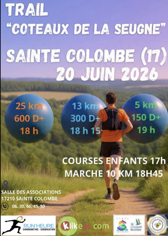 - Retrait des dossards : Maison des associations - Avenue du boulanger - 17210 Sainte Colombe / à partir de 16h30