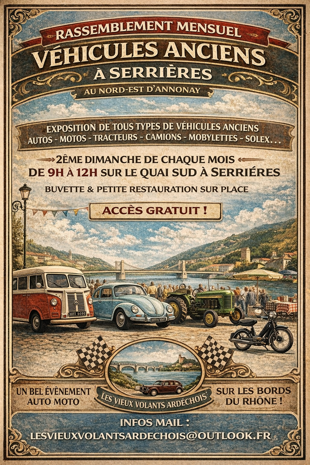 Rassemblement mensuel de Véhicules Anciens à Serrières au nord-est d’Annonay.