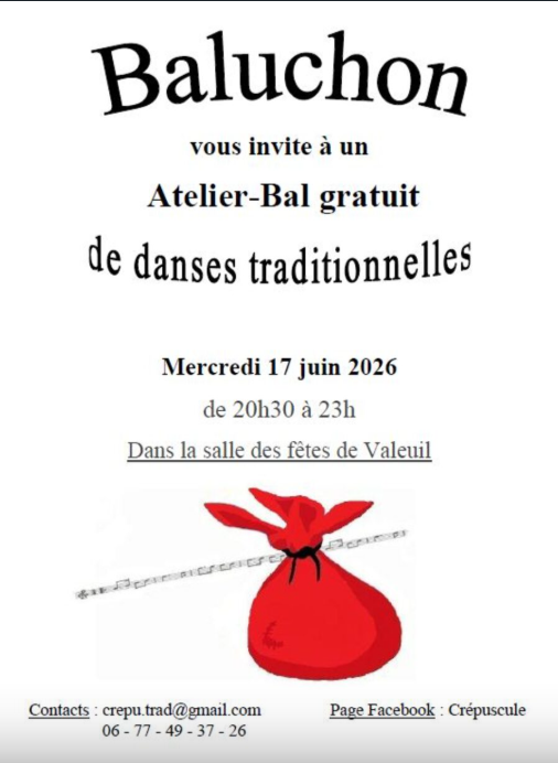 Cette soirée s’organise autour des musiques et des danses traditionnelles : mazurkas, valses (3 tps, 5tps, 8 tps, collectives, écossaises…), scottishs, congos, bourrées (2 tps, 3tps), branles, cercles circassiens, chapelloises, gavottes de l’aven, hanter dro, andro, polkas, rondes du Quercy, rondeaux, israëliennes …