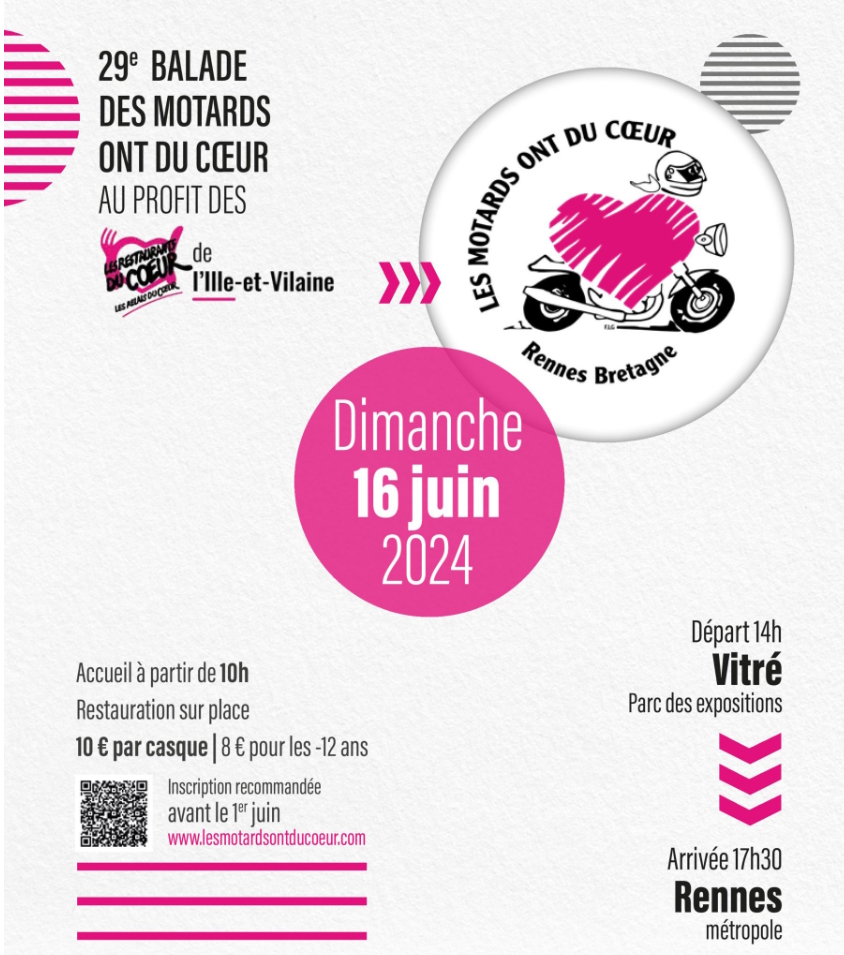 La balade de Motards ont du Cœur 100% au profit des Restos du Cœur aura lieu le dimanche 16 juin 2024.