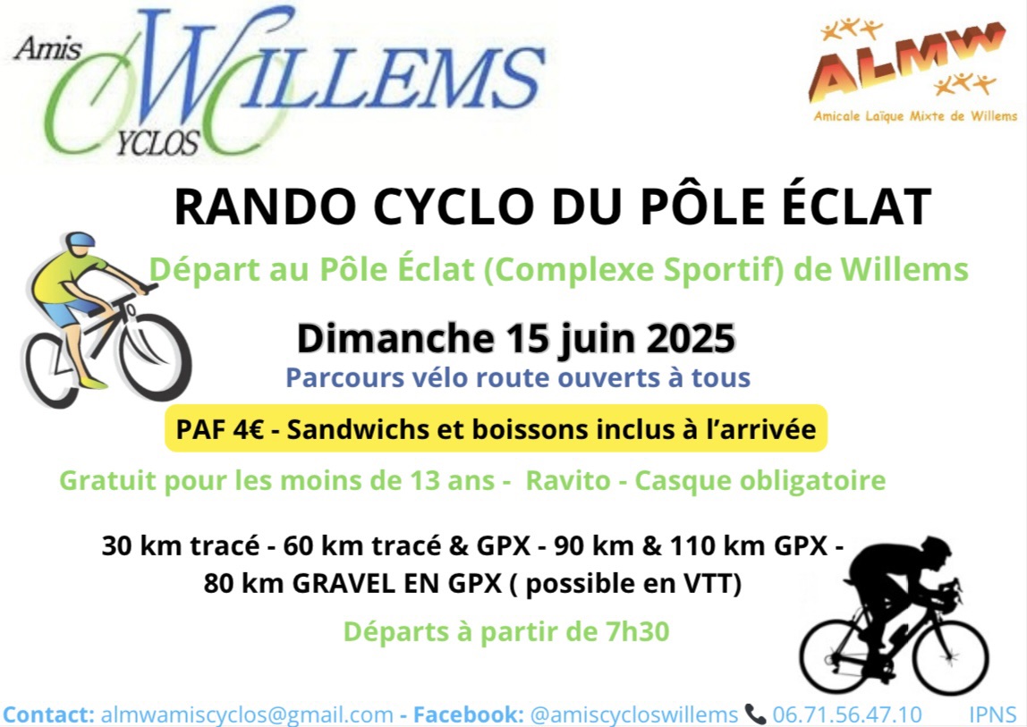 Le 15 juin 2025, elle organise la randonnée cyclo du Pôle éclat à partir de 7h30 à 13h00. Le départ sera au Pôle éclat (Complexe Sportif) de Willems.
